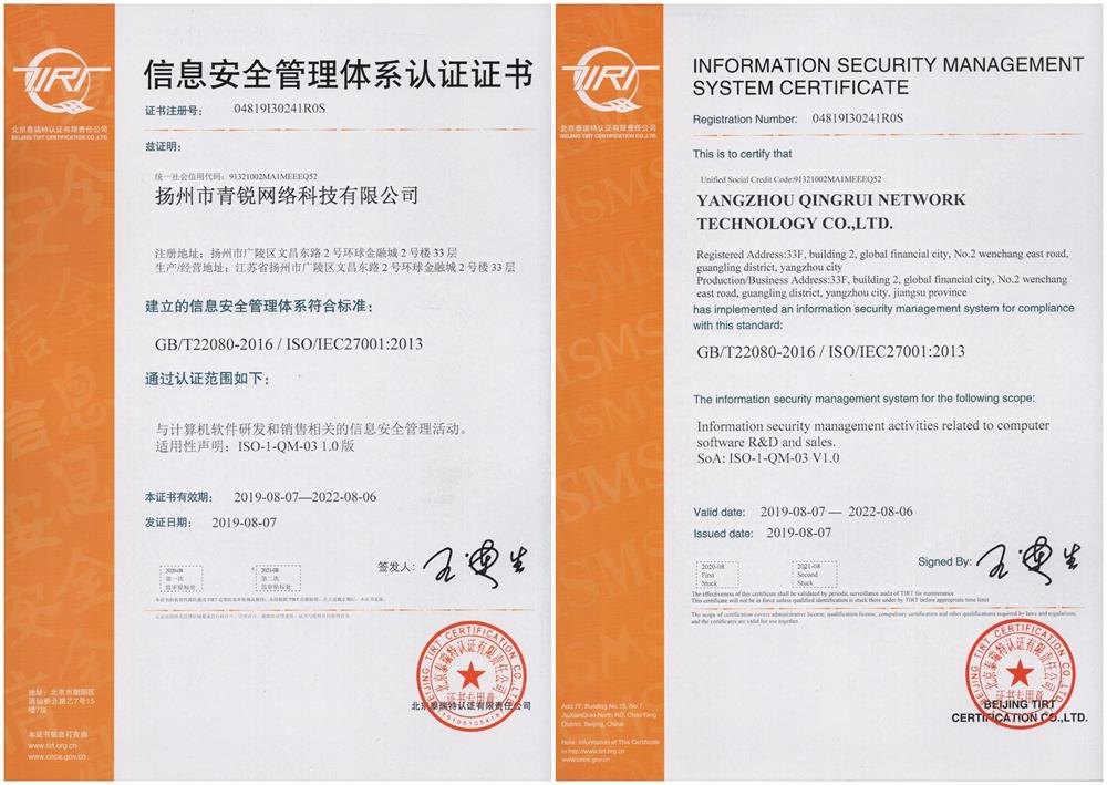 2019年08月21日熱烈祝賀揚州青銳通過ISO27001信息安全體系初次認證熱烈祝賀揚州青銳順利通過ISO27001信息安全體系初次認證,ISO27001作為目前被廣泛接納和采用的信息安全標準,它代表了信息安全管理的國際水準。此次認證,從揚州青銳目前所有的產品本身開始,追根至產品整體研發原始階段的安全管控,確認了青銳自身管理體系,已經...