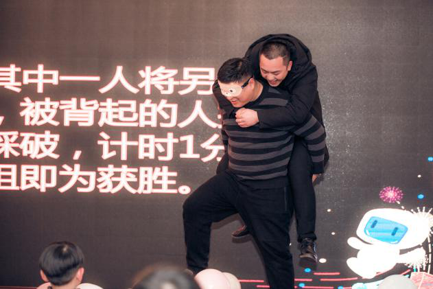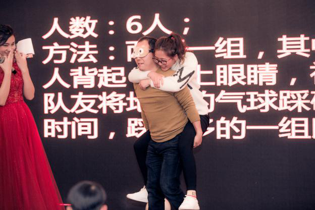 正所謂“男女搭配,干活不累”,伴隨著全場(chǎng)“嘭嘭嘭”,這位優(yōu)秀的企業(yè)家背著小巧的女生,蒙眼連踩28個(gè)氣球,成為全場(chǎng)“最佳默契搭檔”。