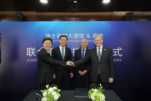 4月25日,百度與瑞士駐華大使館正式簽署聯(lián)合意向書,百度公司董事長(zhǎng)兼 CEO 李彥宏與瑞士聯(lián)邦主席于利·毛雷爾共同見(jiàn)證: